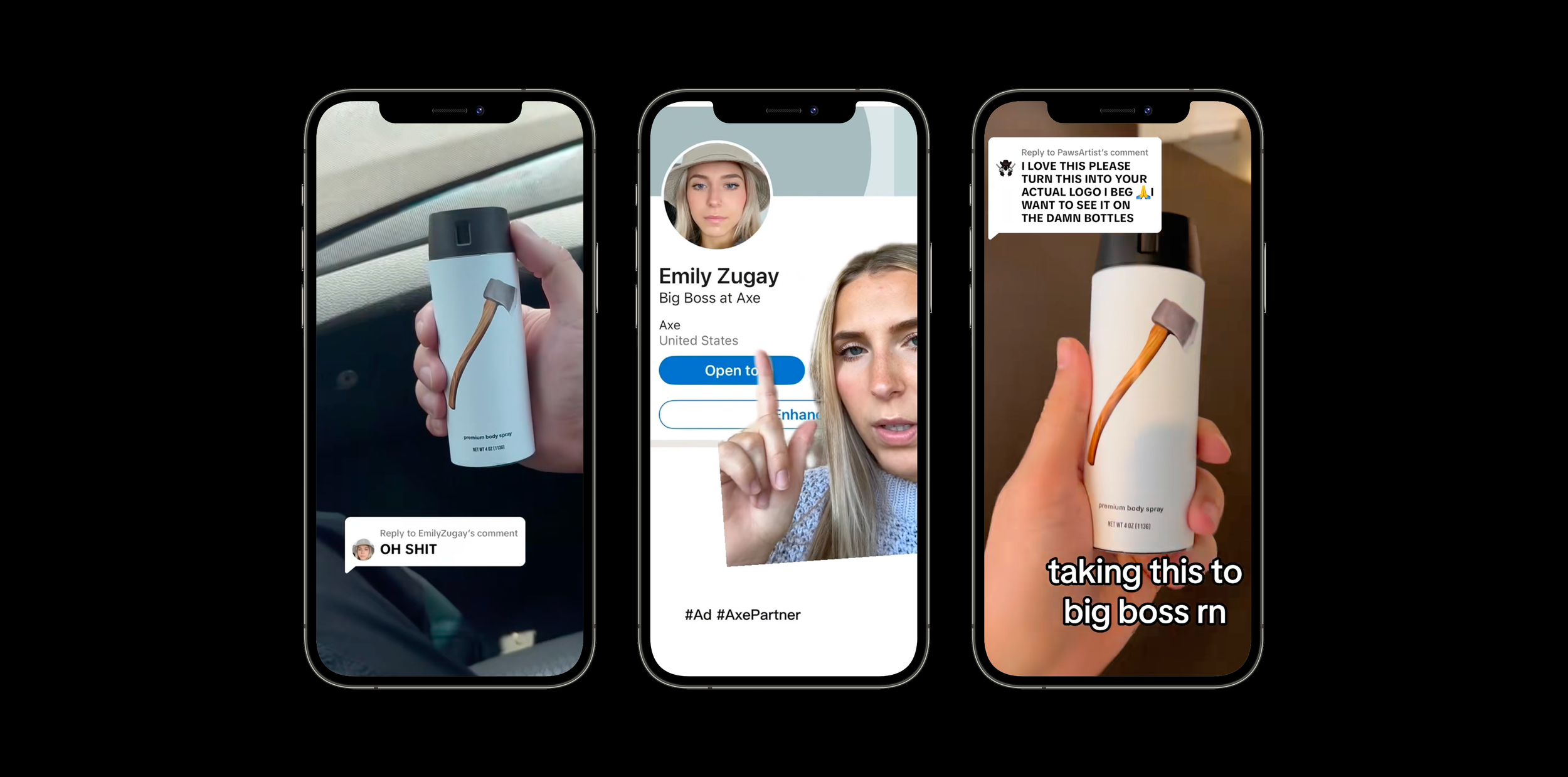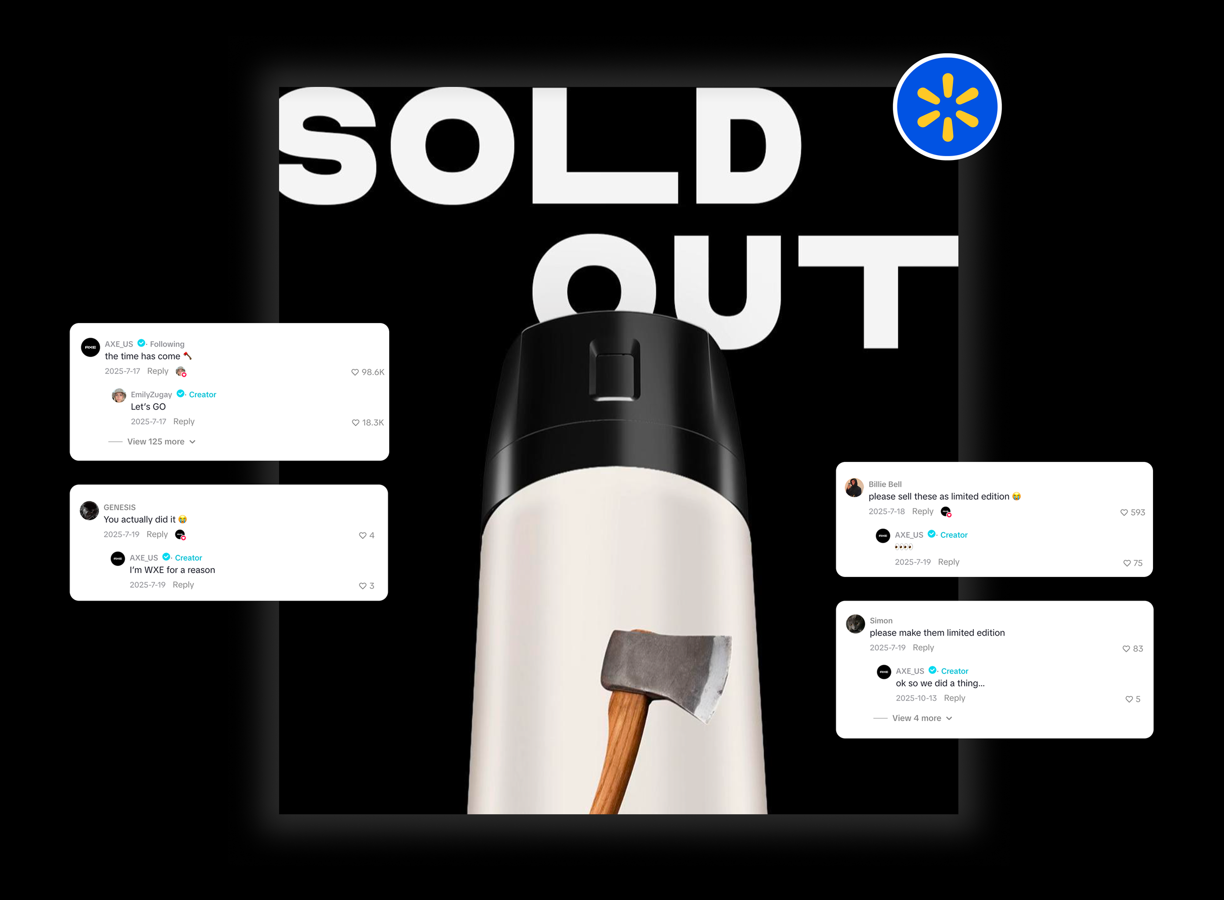 Emily is famous for her unsolicited logo redesigns. When it was AXE’s turn, we went beyond a profile swap or sending a care package. We went all-in, starting with a social content series that introduced her "axe AXE" can to the world and ending with an exclusive partnership with Walmart.